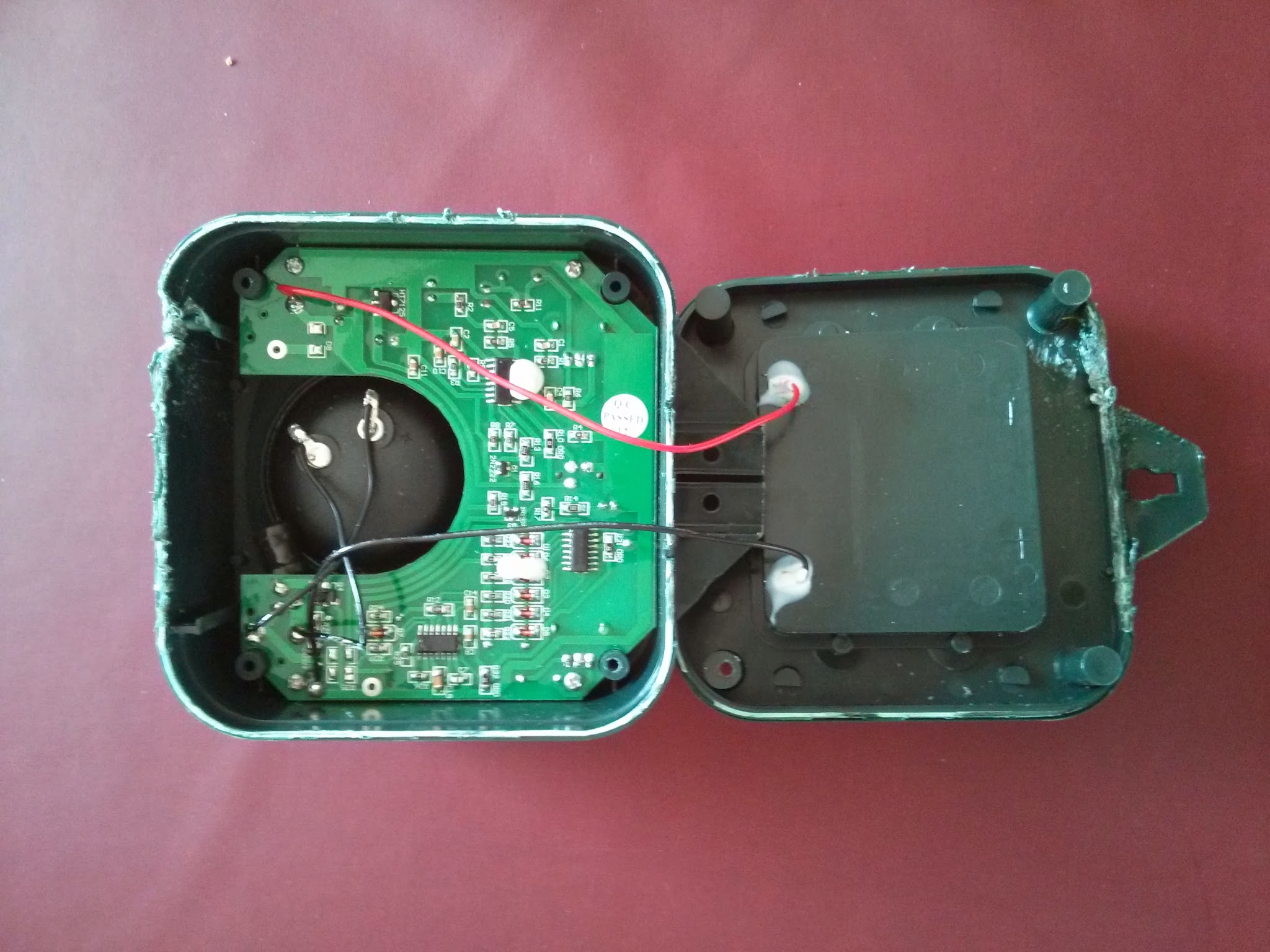 Ultrasonic Cat Deterrent Cracked open. Blue LED is located on the middle right of the PCB as orientated.