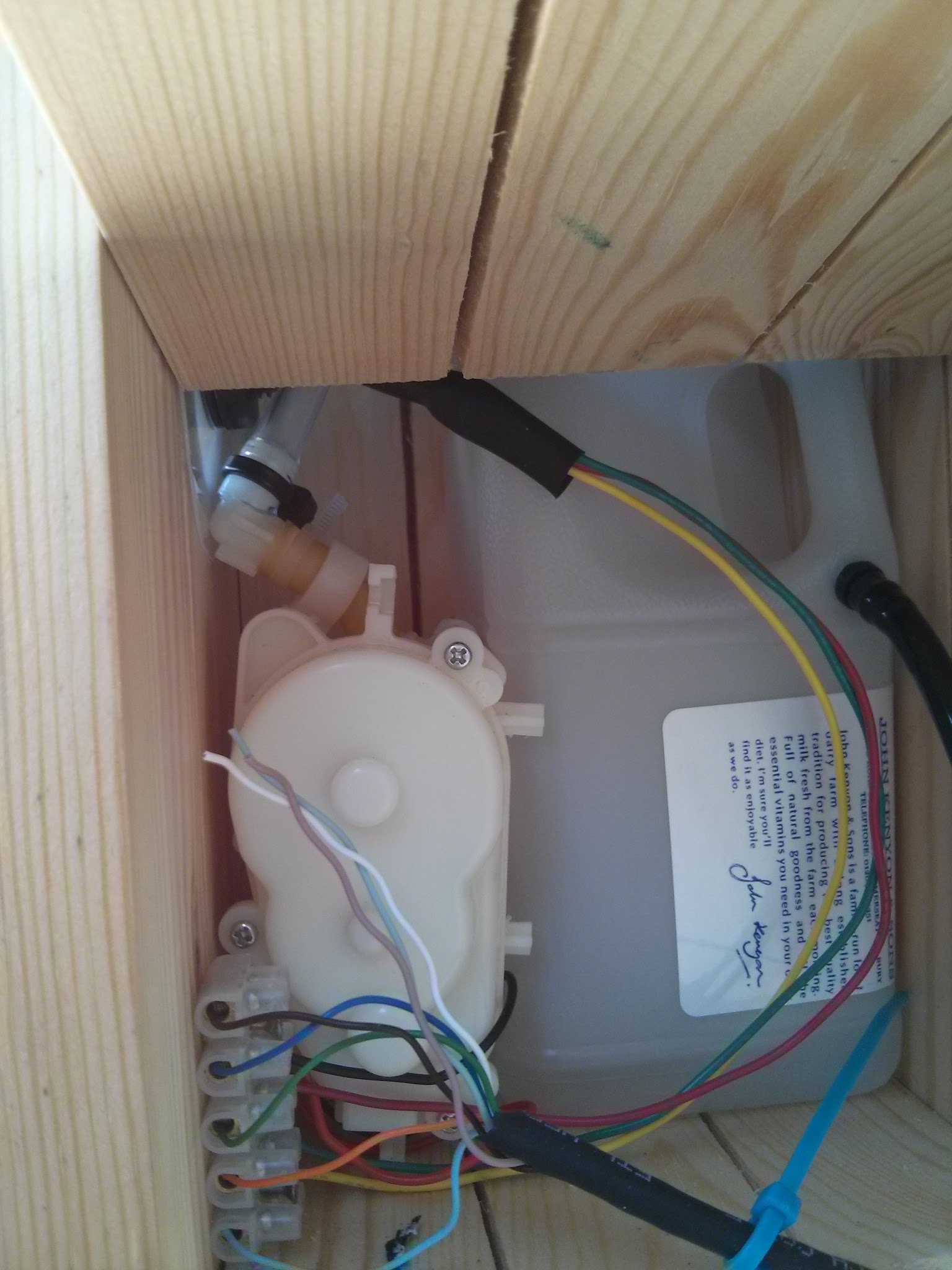 Optionally allow the Ultrasonic to be powered from the PiFace. The heatshrunk object between the two choc blocks is the transistor circuit board. Wires to/from the PiFace are on the Right hand side of the picture. Orange/White wires out are the conections to PiFace Input 0, Red and Green supply voltage to the Ultrasonic.