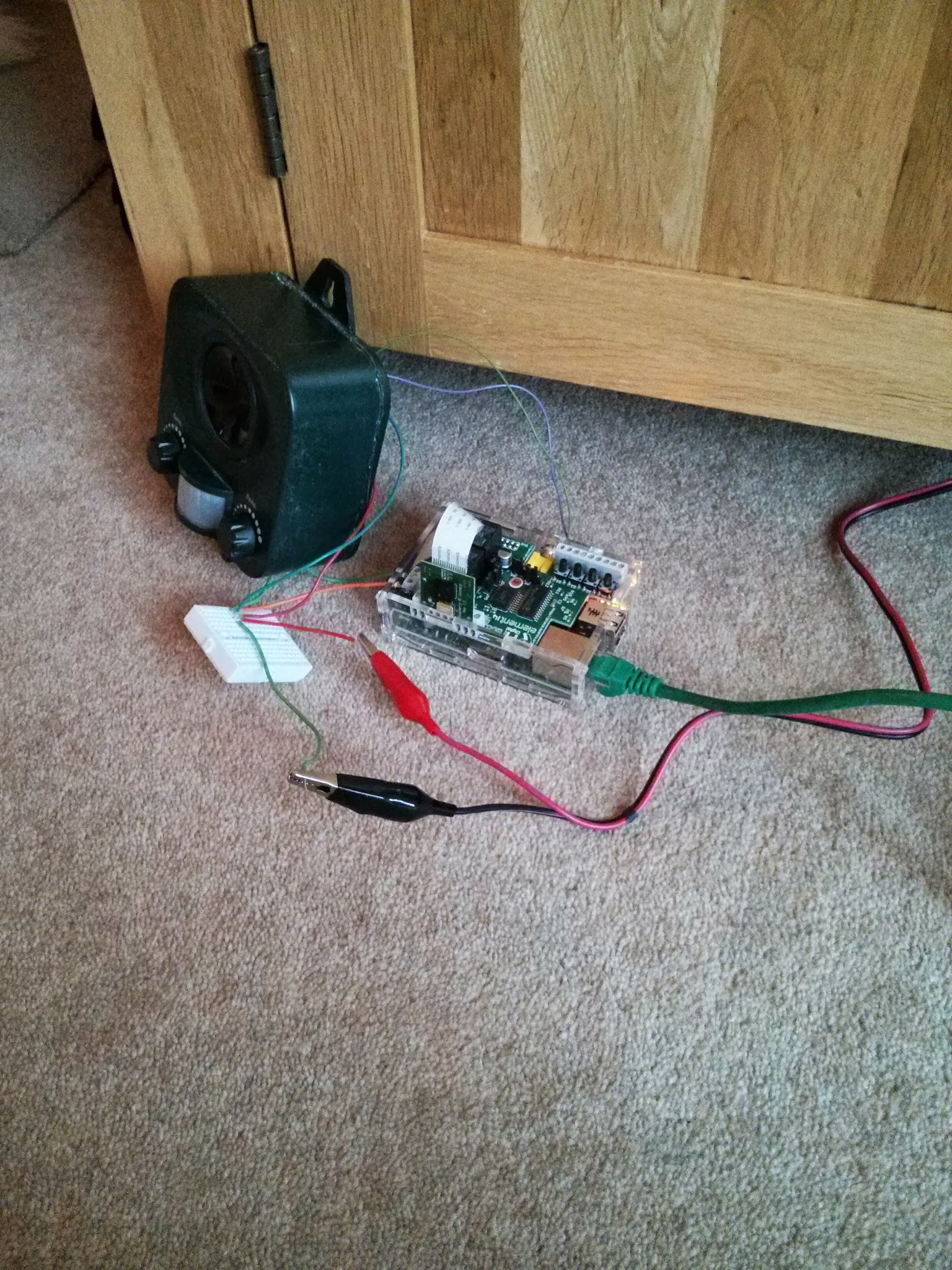 The customer had just had his garden landscaped and wished to stop cats and foxes from leaving tokens of gratitude. It was decided to use a Raspberry Pi. Revision 1 of the project used a PIR detector and failed as the triggering mechanism was too sensitive. It was decided to use a commercial Ultrasonic scarer which has adjustable sensitivity (and sound frequency).