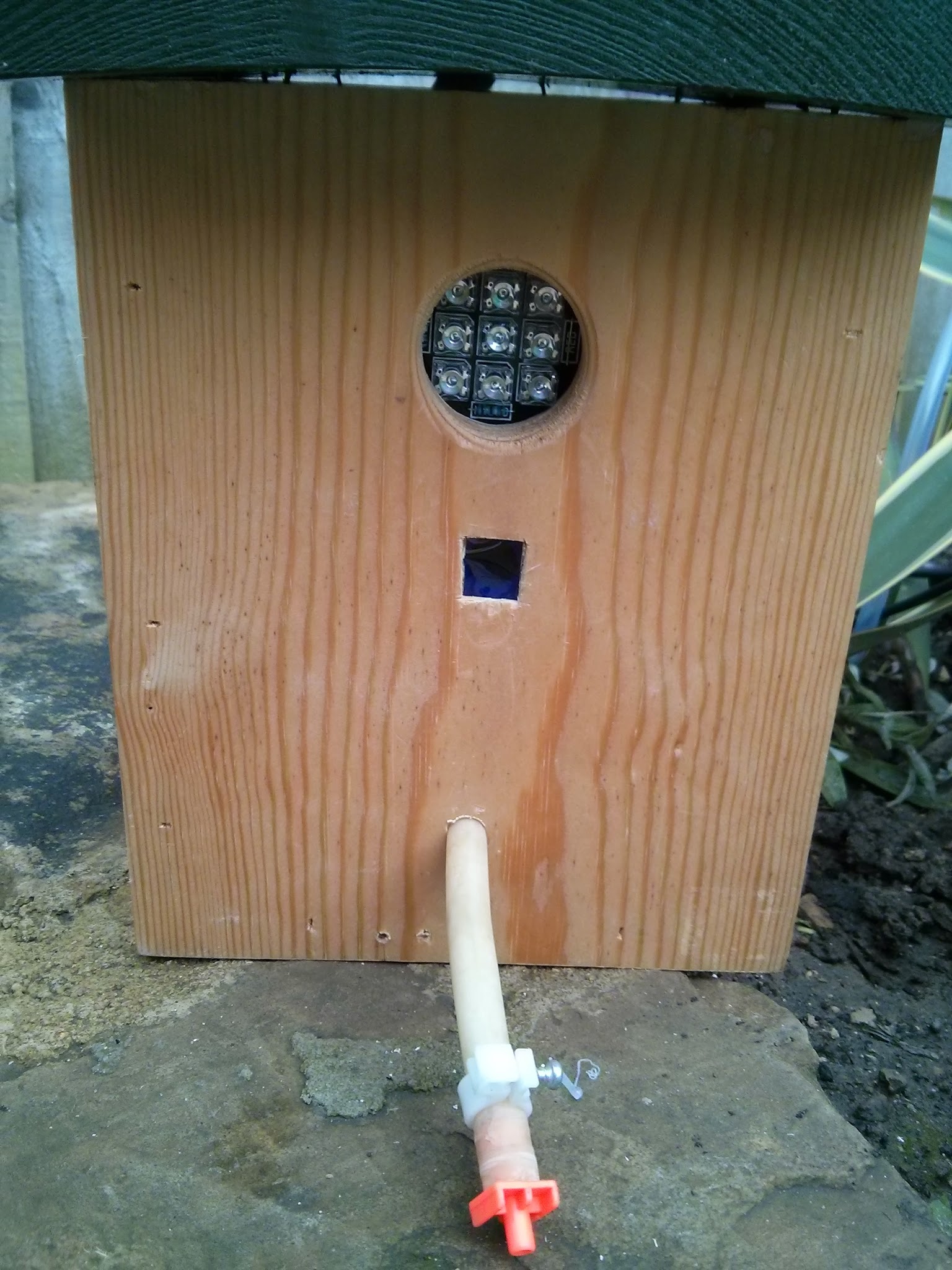 Birdbox with relocated water pistol hole, camera mounted below IR torch. Ultrasonic is to the bottom right of this picture.