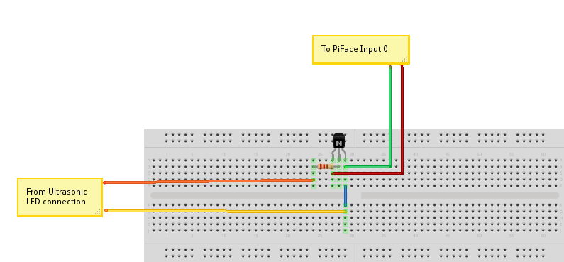 Output of transistor amplifier circuit to PiFace input 0 Relay 0 of PiFace attached to Water Pistol. Relay 1 of PiFace attached to 5V from the PiFace (in case customer wishes to disarm the Ultrasonic remotely). 5V from the Relay 1 and Ground from the PiFace to the Ultrasonic.